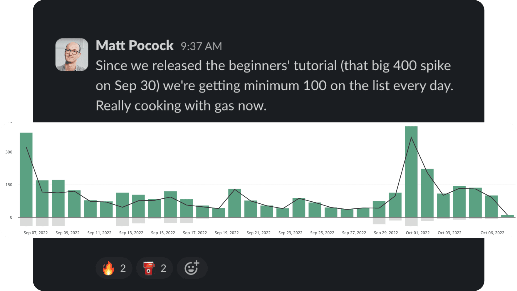 Beyond list growth, the tutorials have also provided valuable feedback for Matt on where to double down in the approach to creating learning content — such as the short “problem-solve-solution” loop, the way he speaks quite naturally, and the mix of text and video.