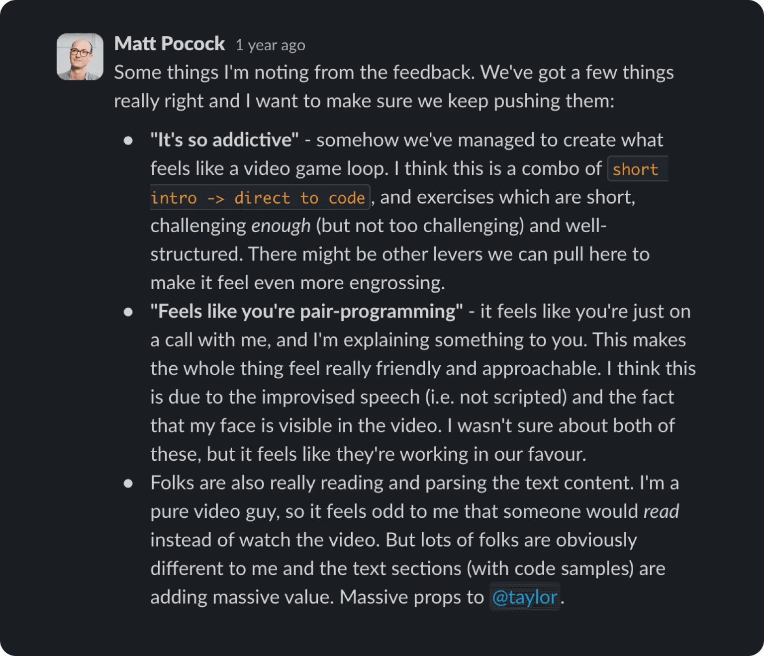 Throughout the process, we talk through the topics and scope of what learning material Matt produces. Occasionally that’s through planning call, but a lot of our work together is async over Slack.